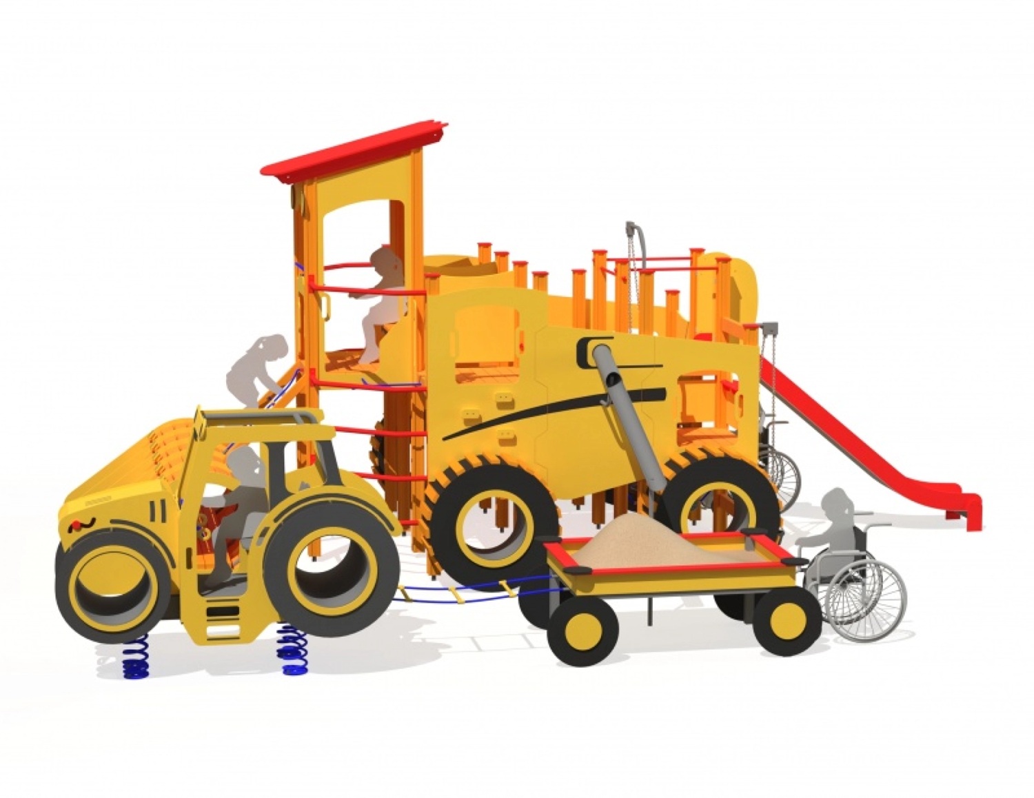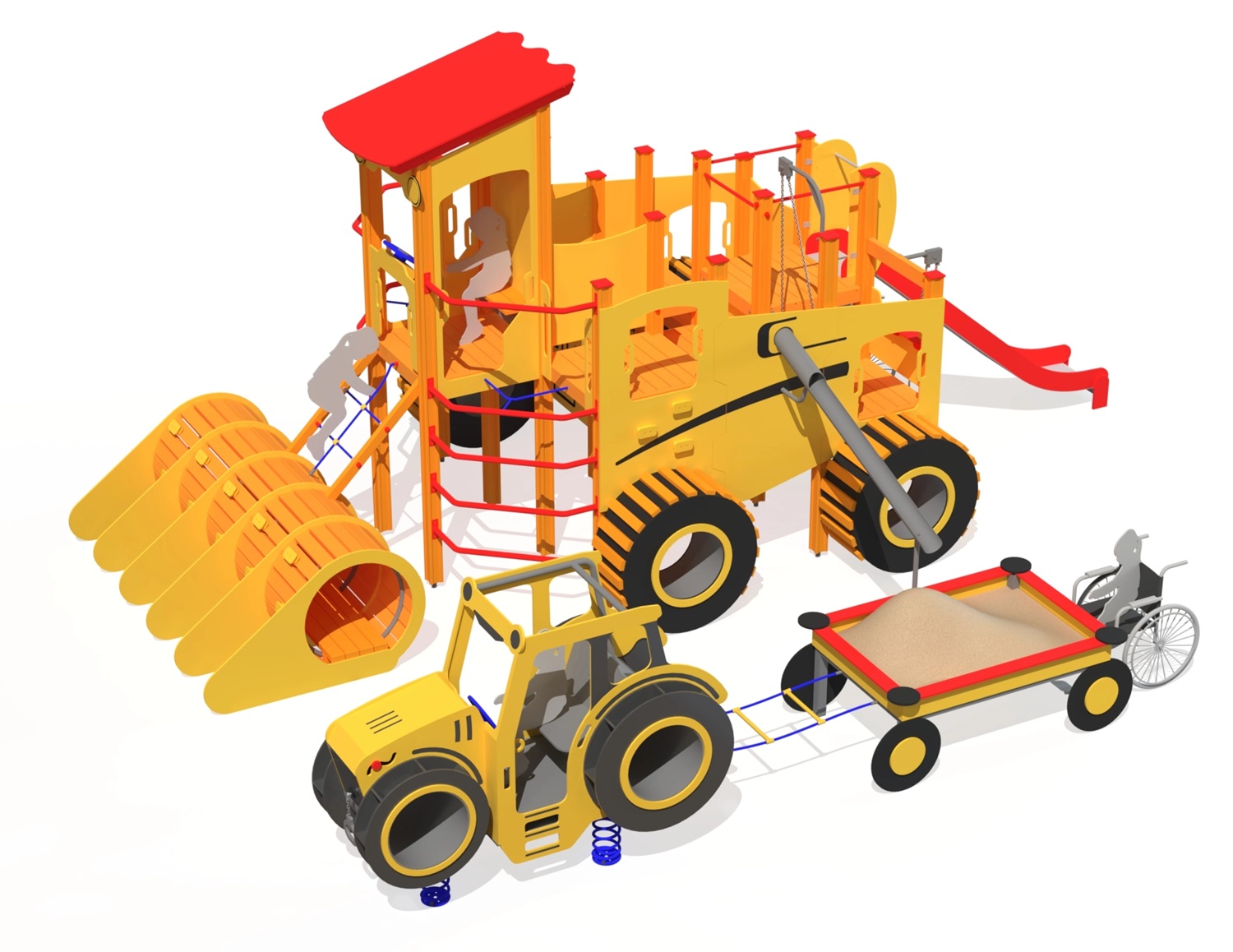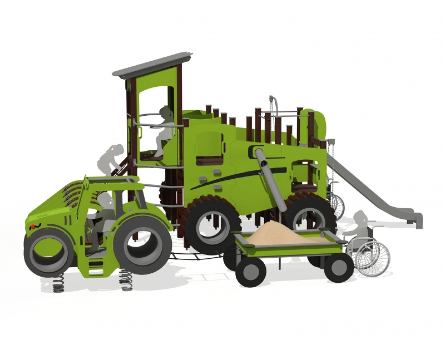 Flera delar av konstruktionen är tillgängliga för barn med särskilda behov och rullstolsburna, vilket gör Skördetröska med traktor och släp till ett inkluderande lekredskap för alla barn. 💚