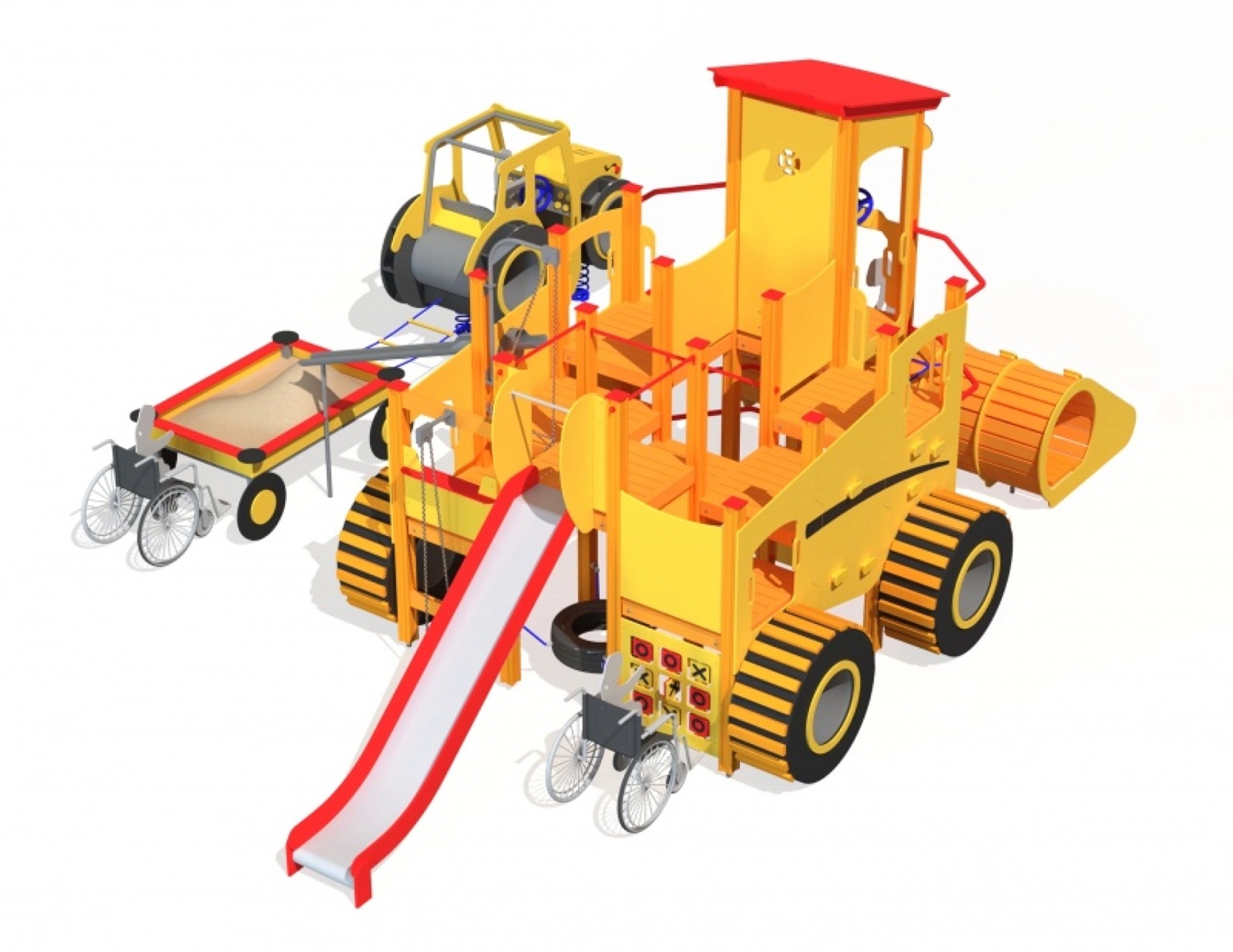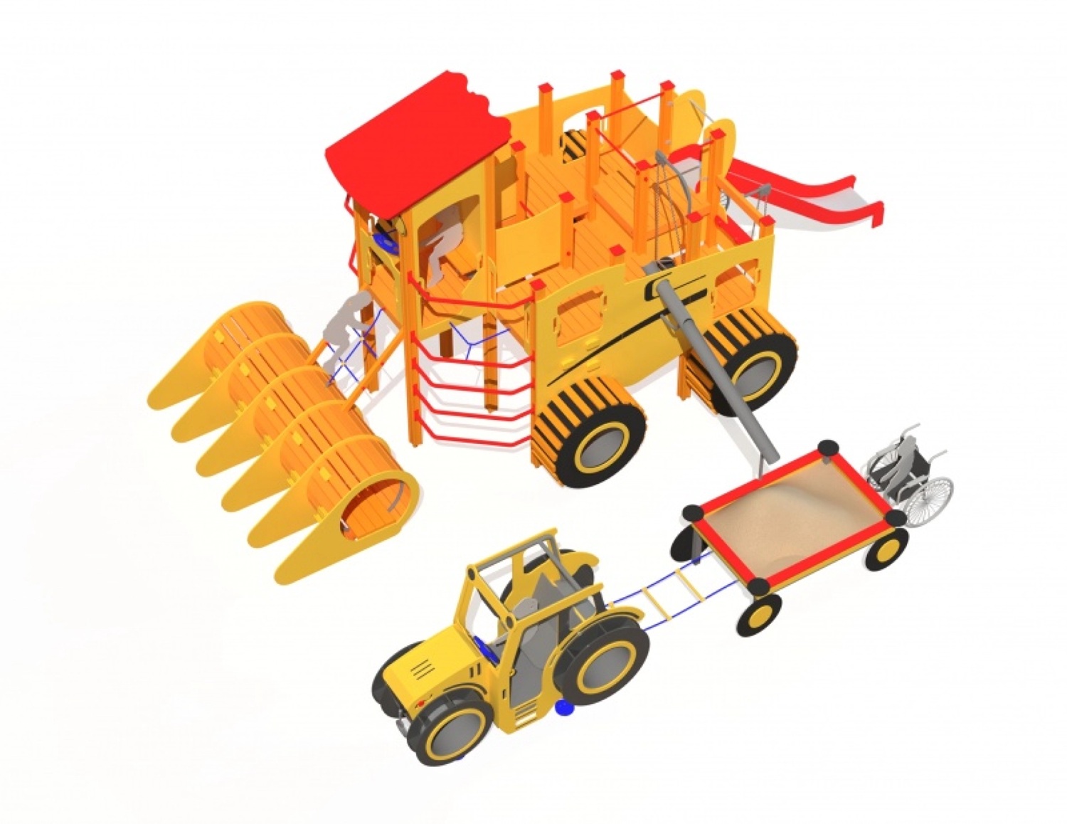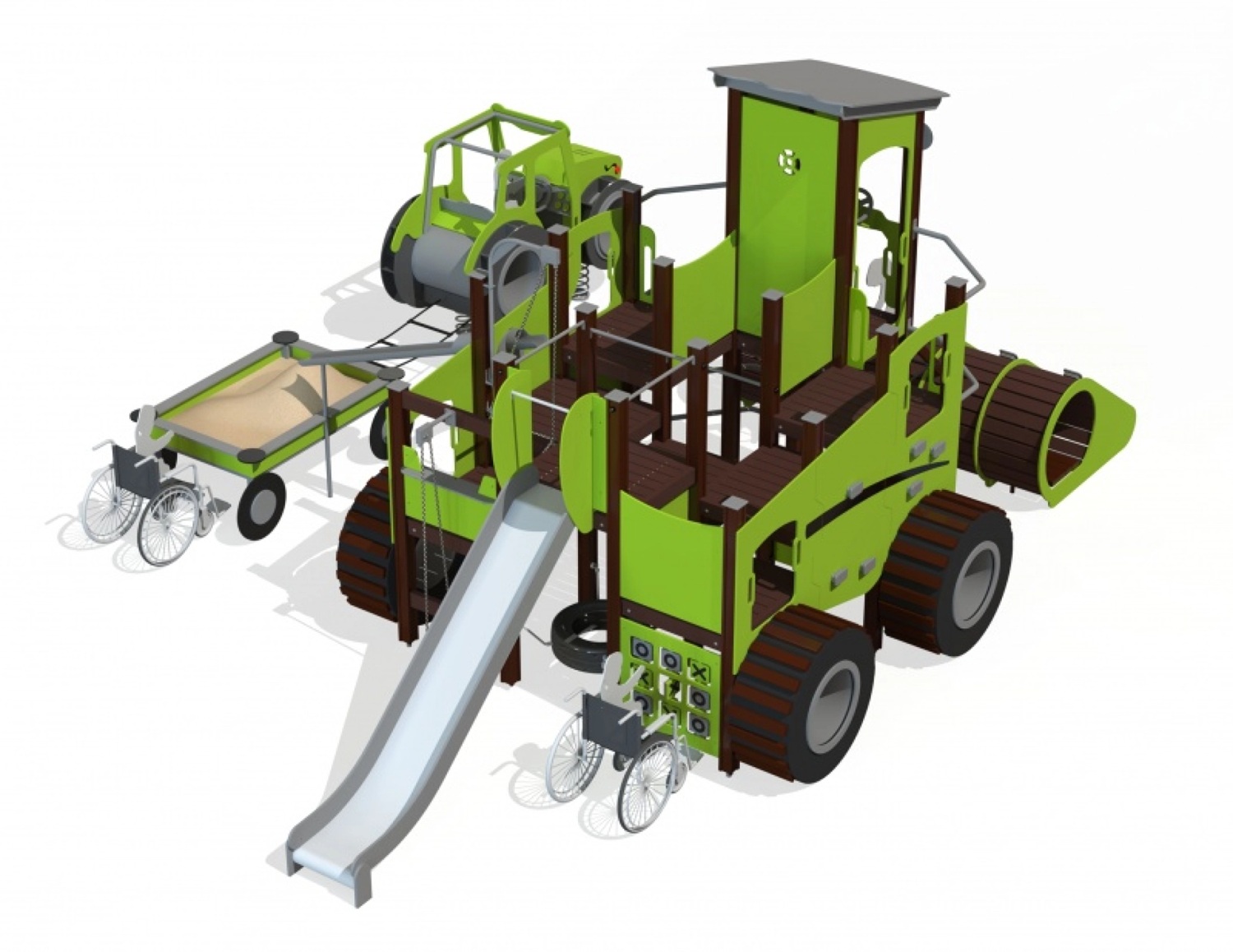 Flera delar av konstruktionen är tillgängliga för barn med särskilda behov och rullstolsburna, vilket gör Skördetröska med traktor och släp till ett inkluderande lekredskap för alla barn. 💚