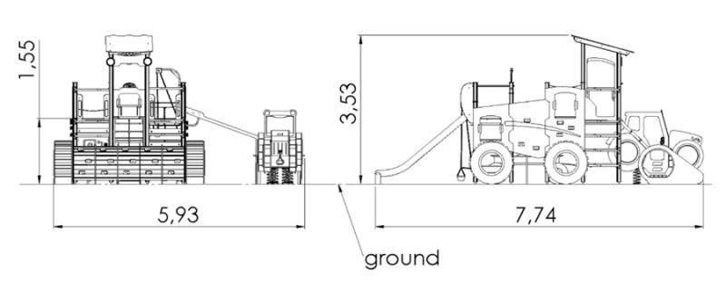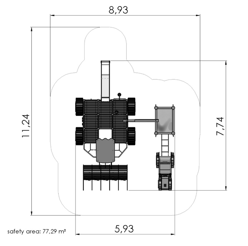 🔹 Extra lång tröskfront med krypgång och klätterslänt med lutande klätternät som leder upp till förarhytten.