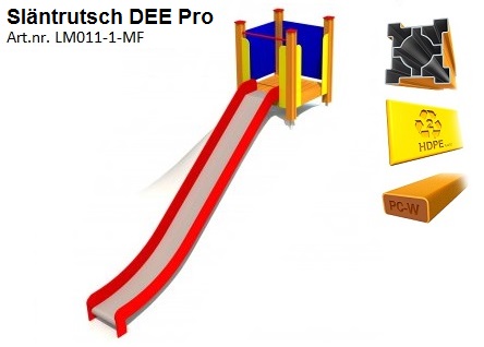 DEE är är en rutsch speciellt framställd för slänter/kullar med säker plattform enligt EN1176.