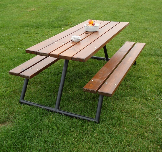 Stockholm picknick, 6 personer en modern version av en rastmöbel! Svensktillverkad i FSC-märkt norrlandsfuru som brunlaseras. Svart pulverlackerat kraftigt 45mm rörstativ med 40 mm godstjocklek vilket ger mycket bra stabilitet.