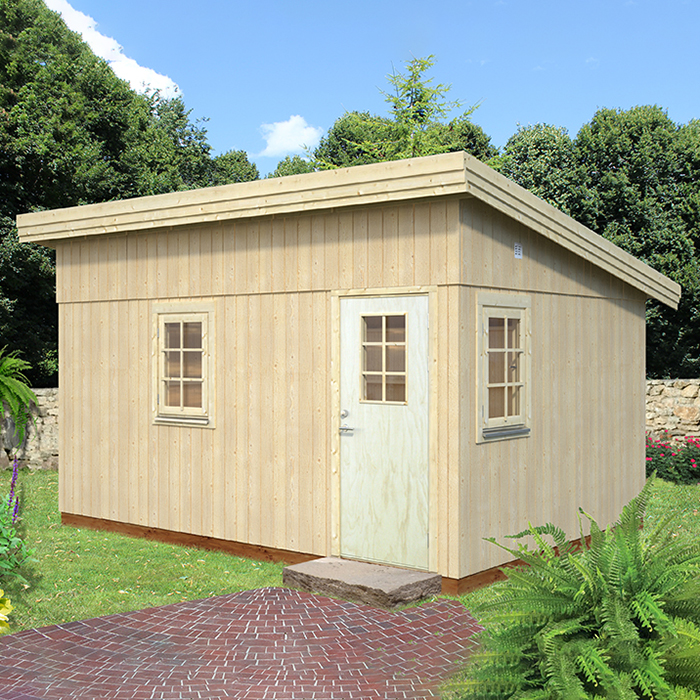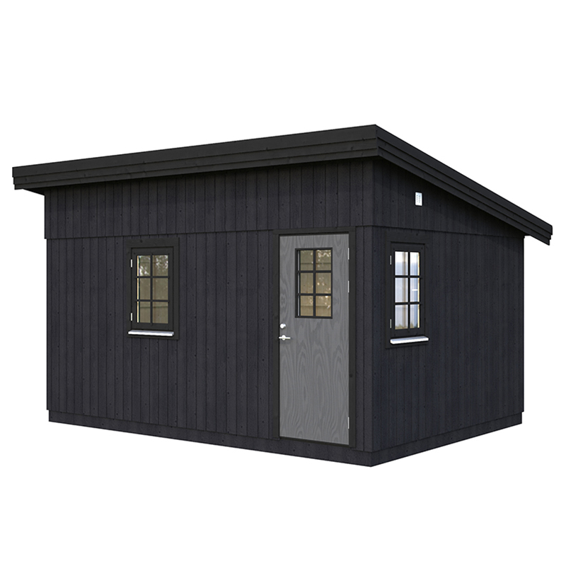 Stugan Ethel har en modern design med sitt flacka tak, som kombineras med sin klassiska stil på fönster och dörr med spröjs. Tack vare sin praktiska storlek kan stugan enkelt placeras i trädgården. Ethel ger ett perfekt extrautrymme att använda som gästhus, båthus, hemmakontor eller varför inte ett eget litet gym. Stugan levereras i en komplett byggsats och med möjligheten att placera väggar, dörrar och fönster som du själv önskar. Det gör att du enkelt anpassar utseendet efter eget behov och smak. Det går dessutom utmärkt att lägga till fler fönster för ett ännu större ljusinsläpp.
