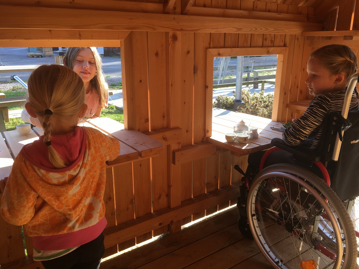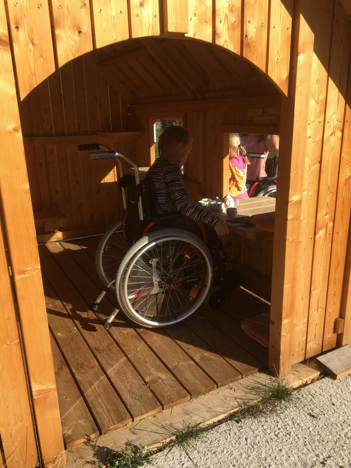 Kiosken har också två olika höjdnivåer på affärsdisken. Diskarna skjuter över på båda sidor i syfte att barn i rullstol dels ska nå upp men också kunna köra fram ordentligt för att nå leken.