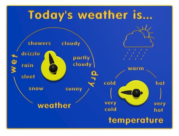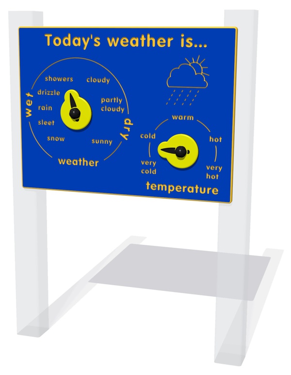 What’s the weather forecast today? Great for educational purposes, the Todays Weather is….Play Panel encourages children to interact based on the current weather forecast.Constructed from HDPE, the panel features two rotating weather points and can either be wall or post mounted. Perfect for the playground or play space.