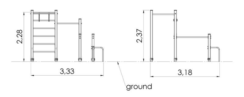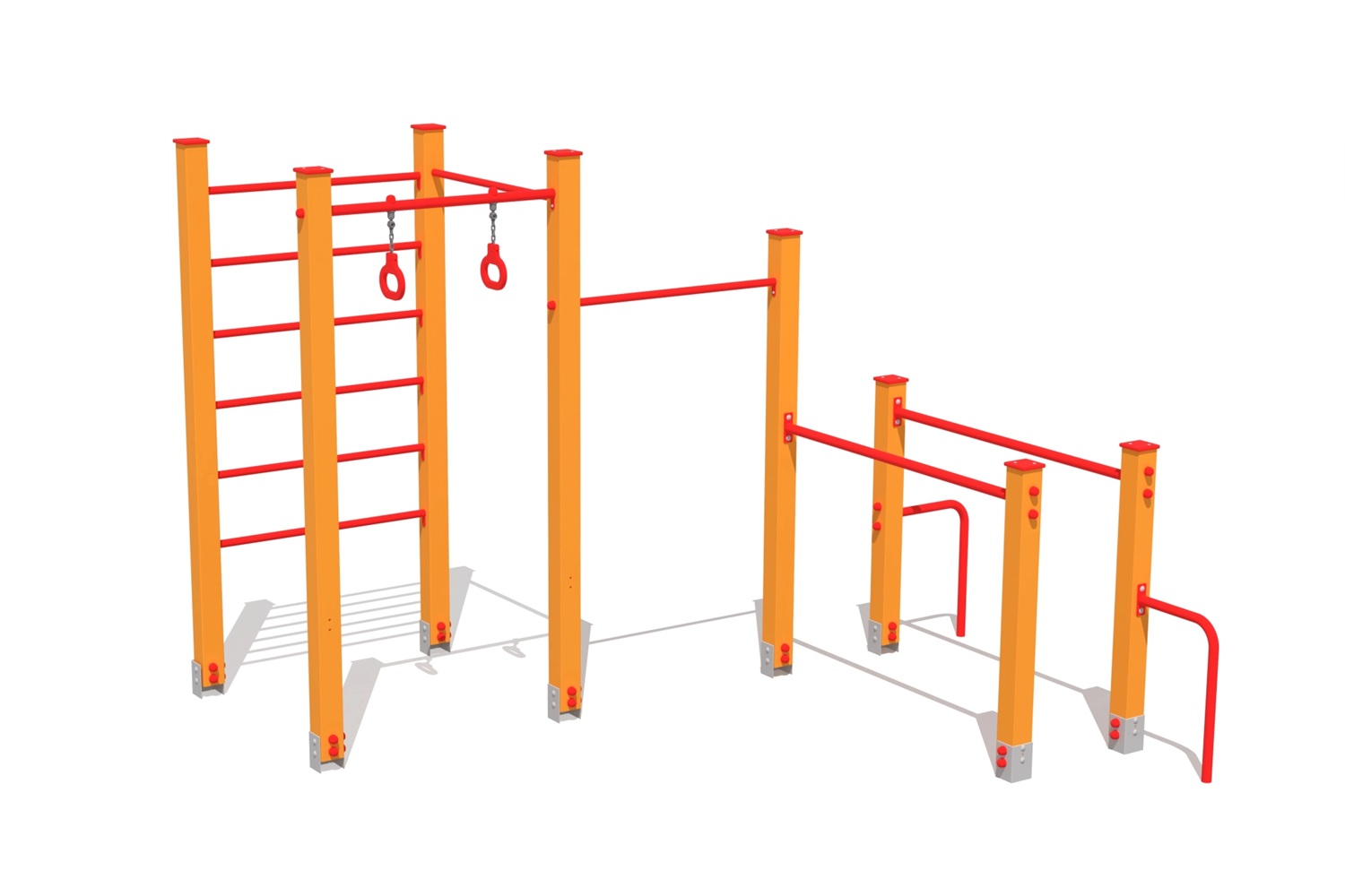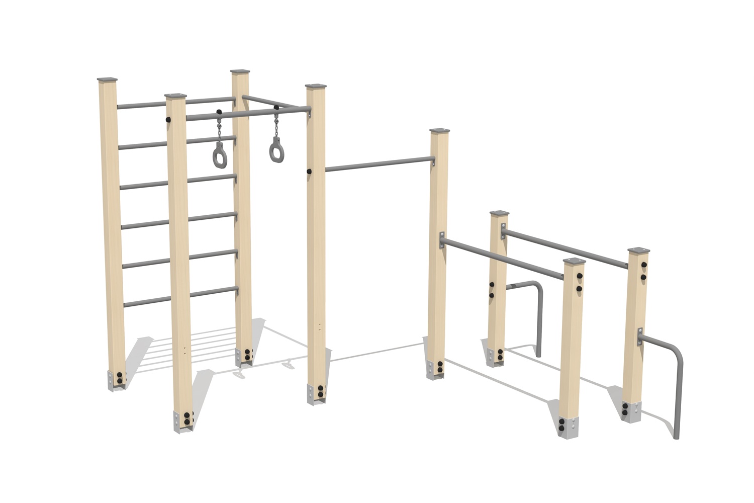 Anläggningen består av parallella räcken, klätterstege, bänk för magövningar, samt hängstång, varav en är utrustad med ringar för extra träningsvariation. ✨