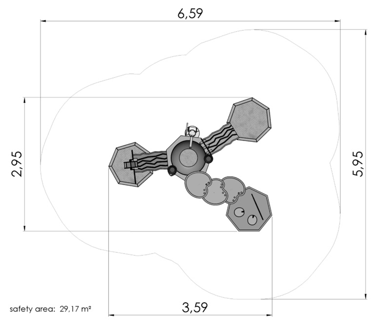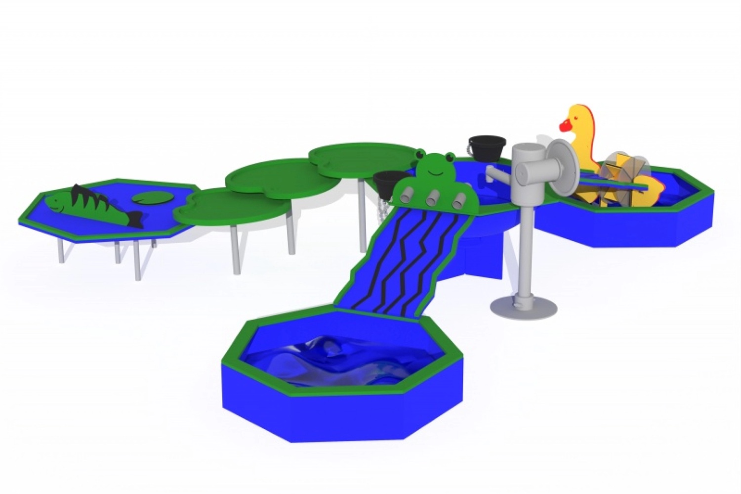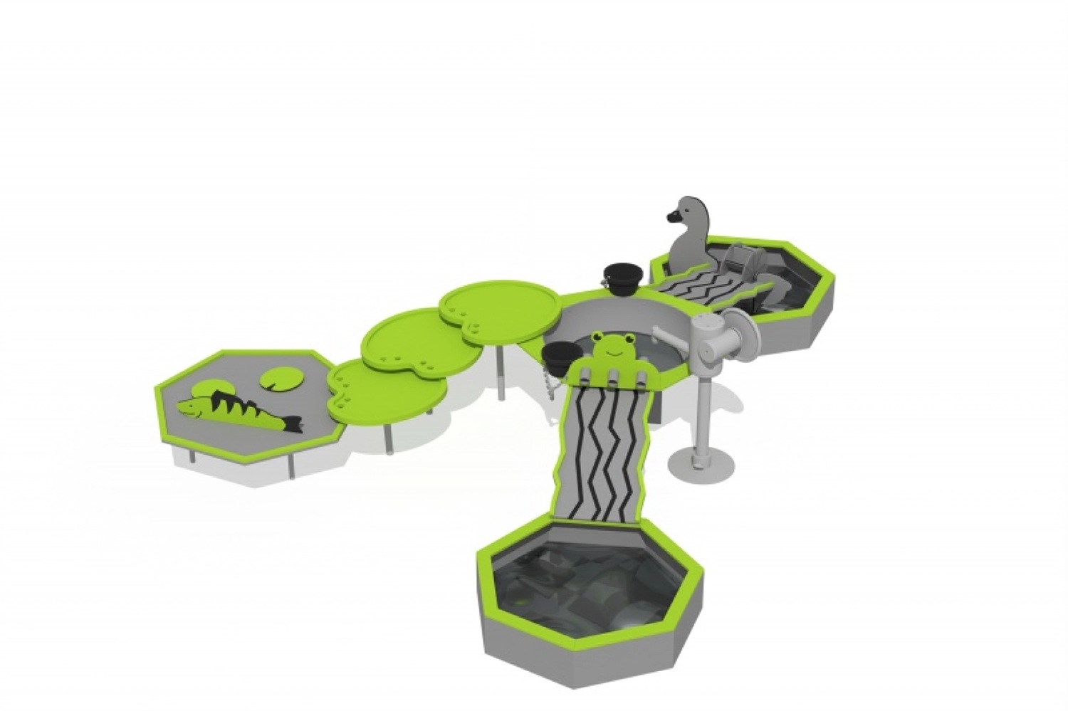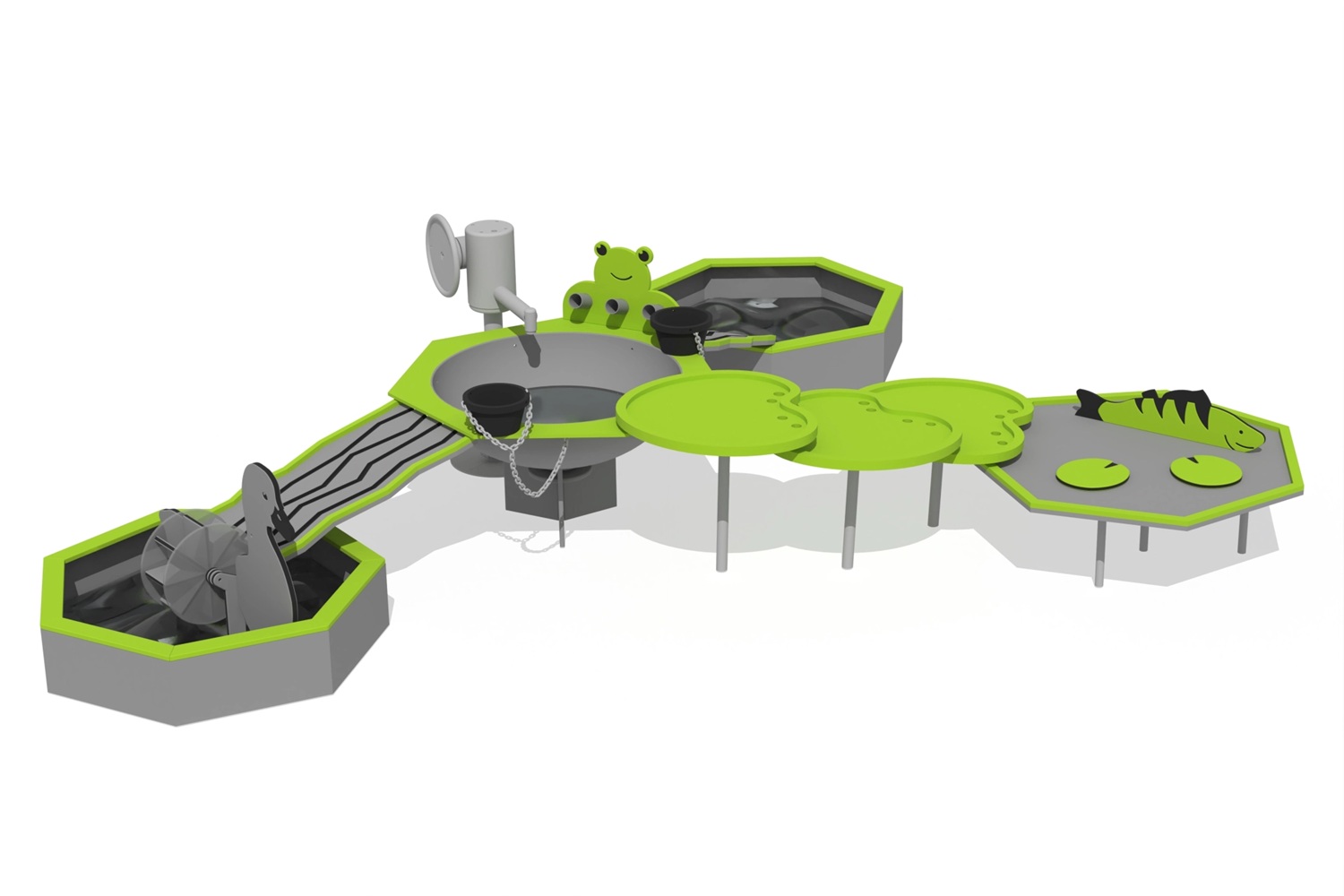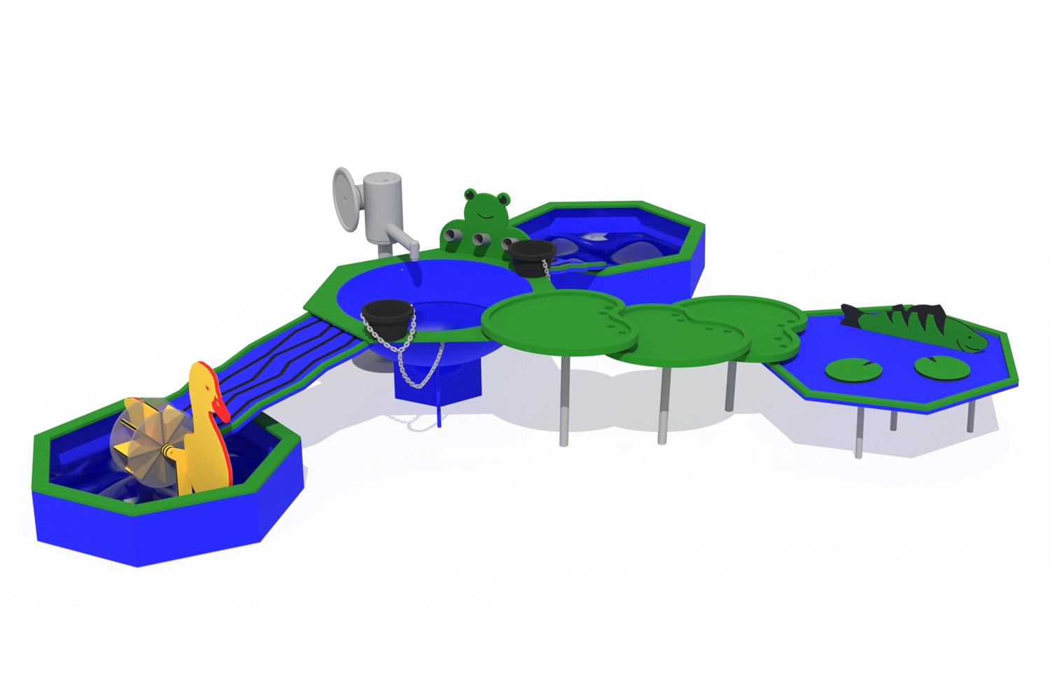 🔹 3 lutande bord formade som näckrosblad, med hål som låter sand eller vatten rinna vidare till nästa nivå.